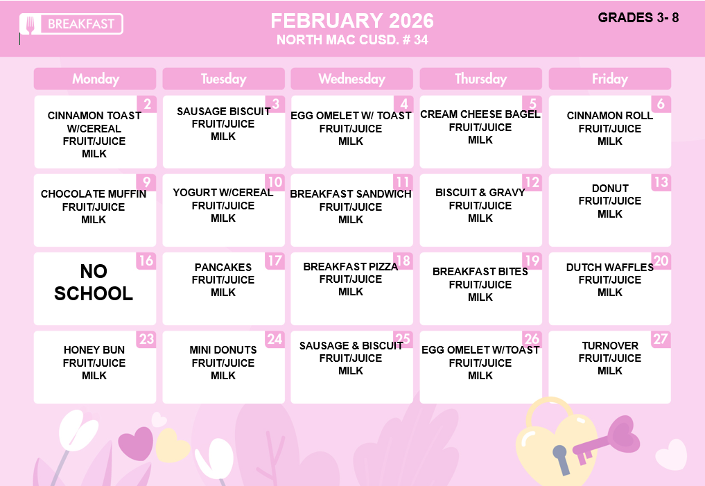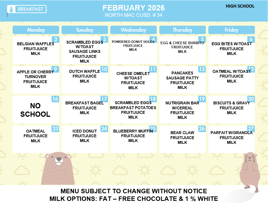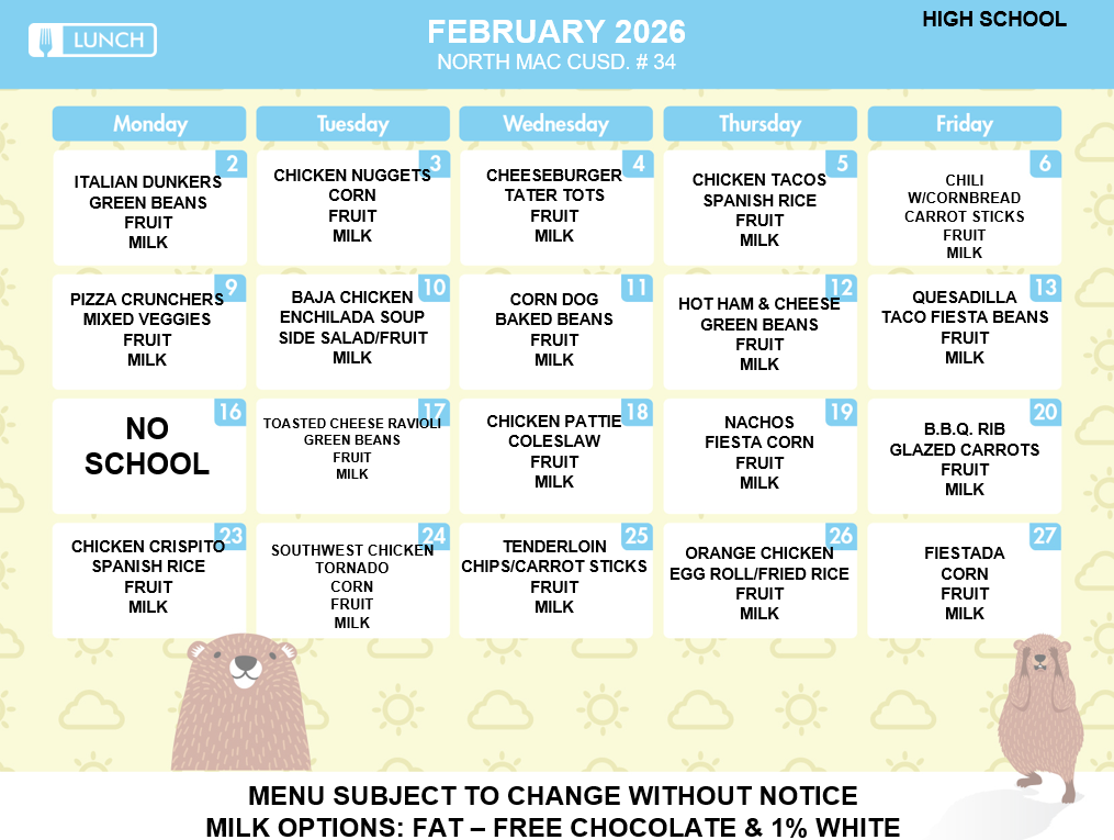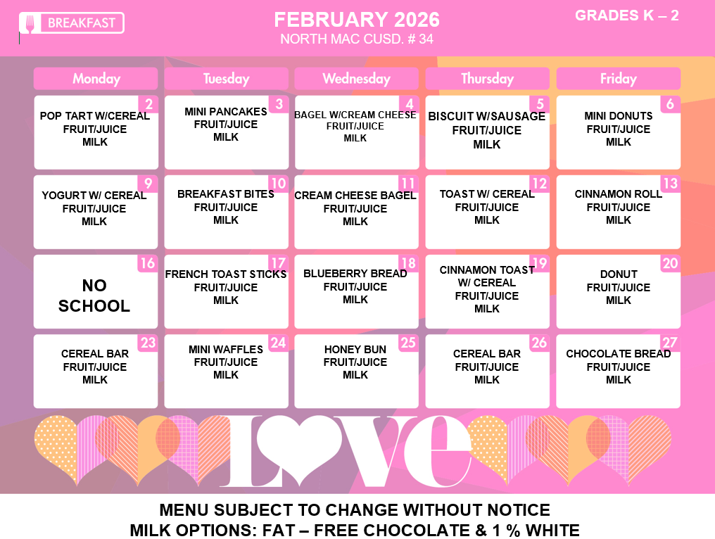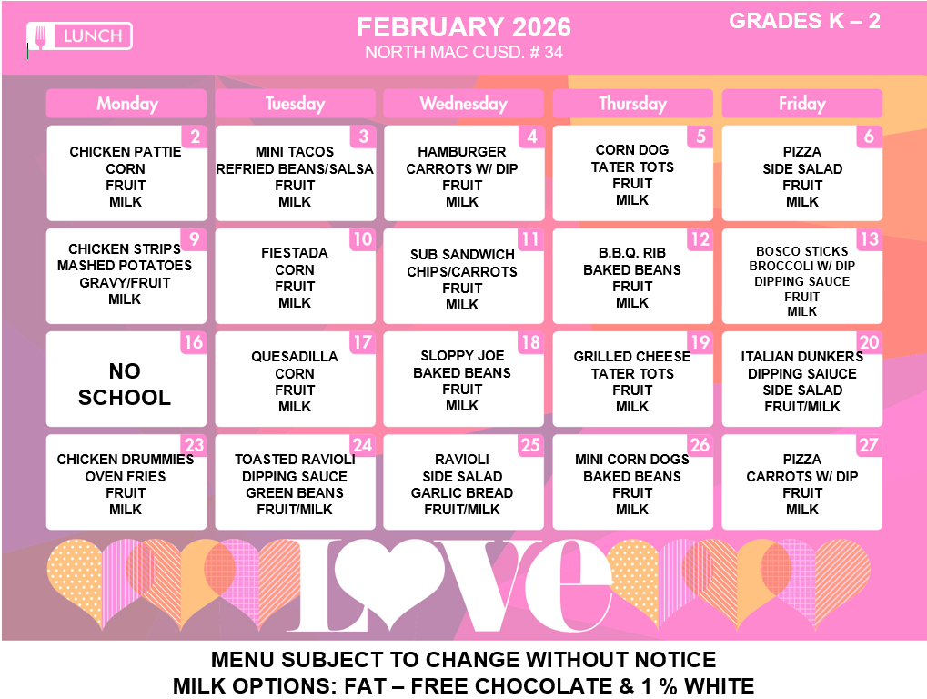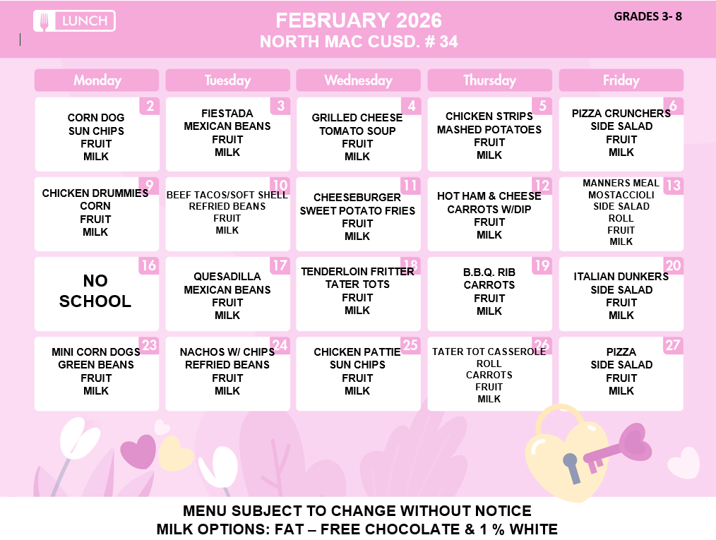 Pay attention to the menus. There is now a different menu for each of the 3 school locations. K-2, 3-8, and 9-12.